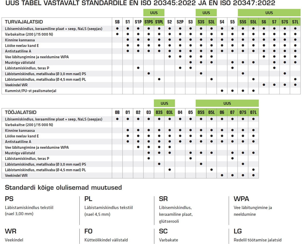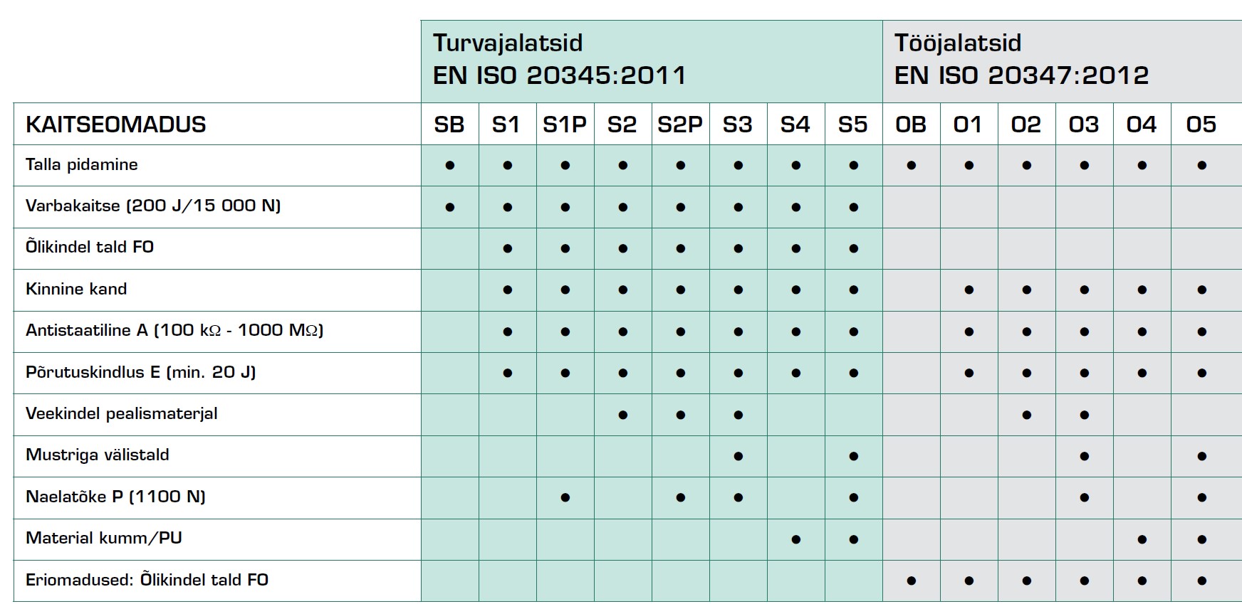 Standardite EN ISO 20345:2011 ja EN ISO 20347:2012 lisaomadused: