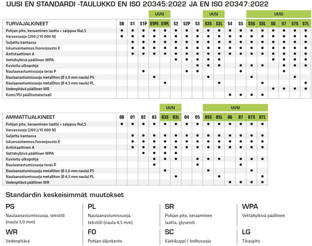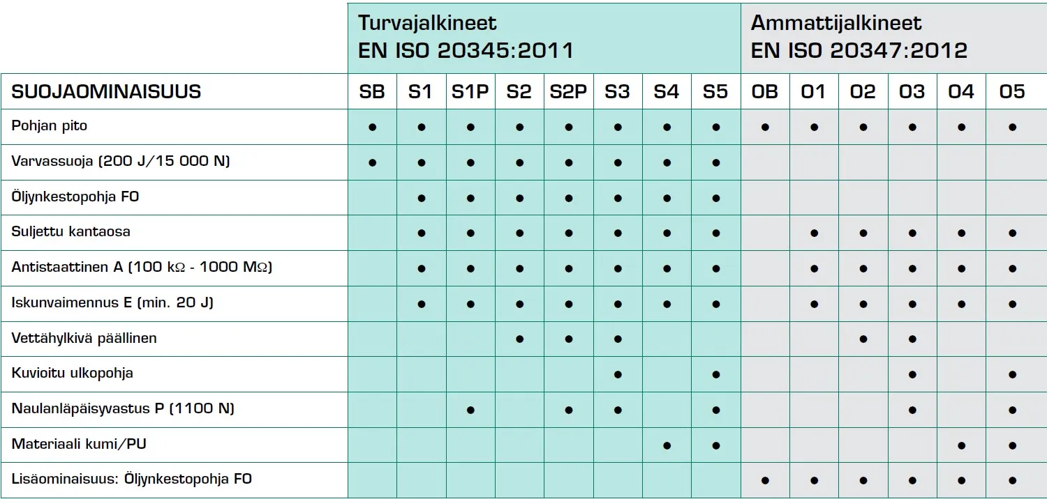 Standardien EN ISO 20345:2011 ja EN ISO 20347:2012 lisäominaisuudet: