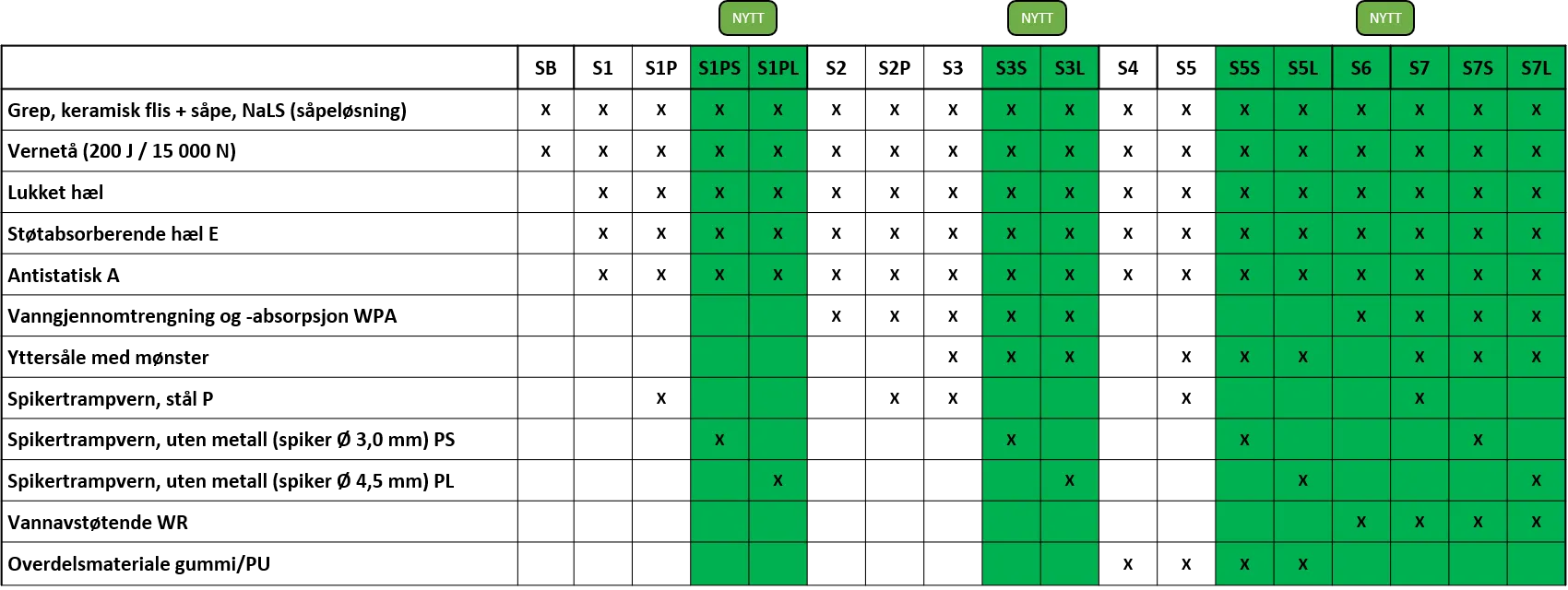 Den nye tabellen iht. standard EN ISO 20345:2022