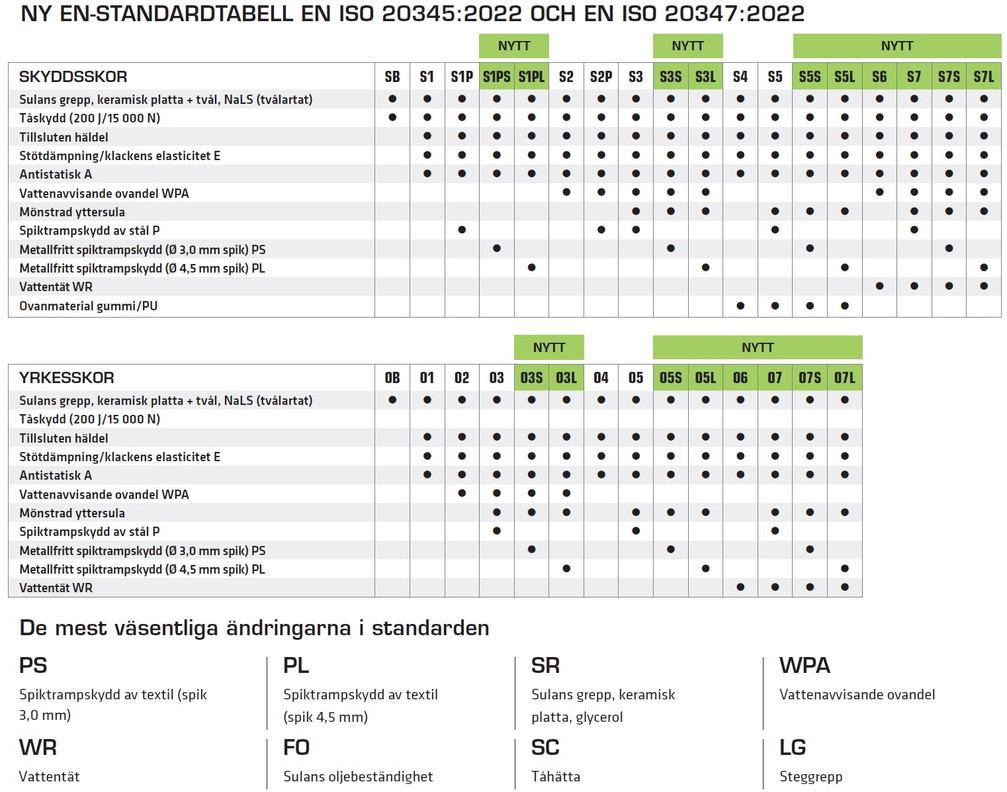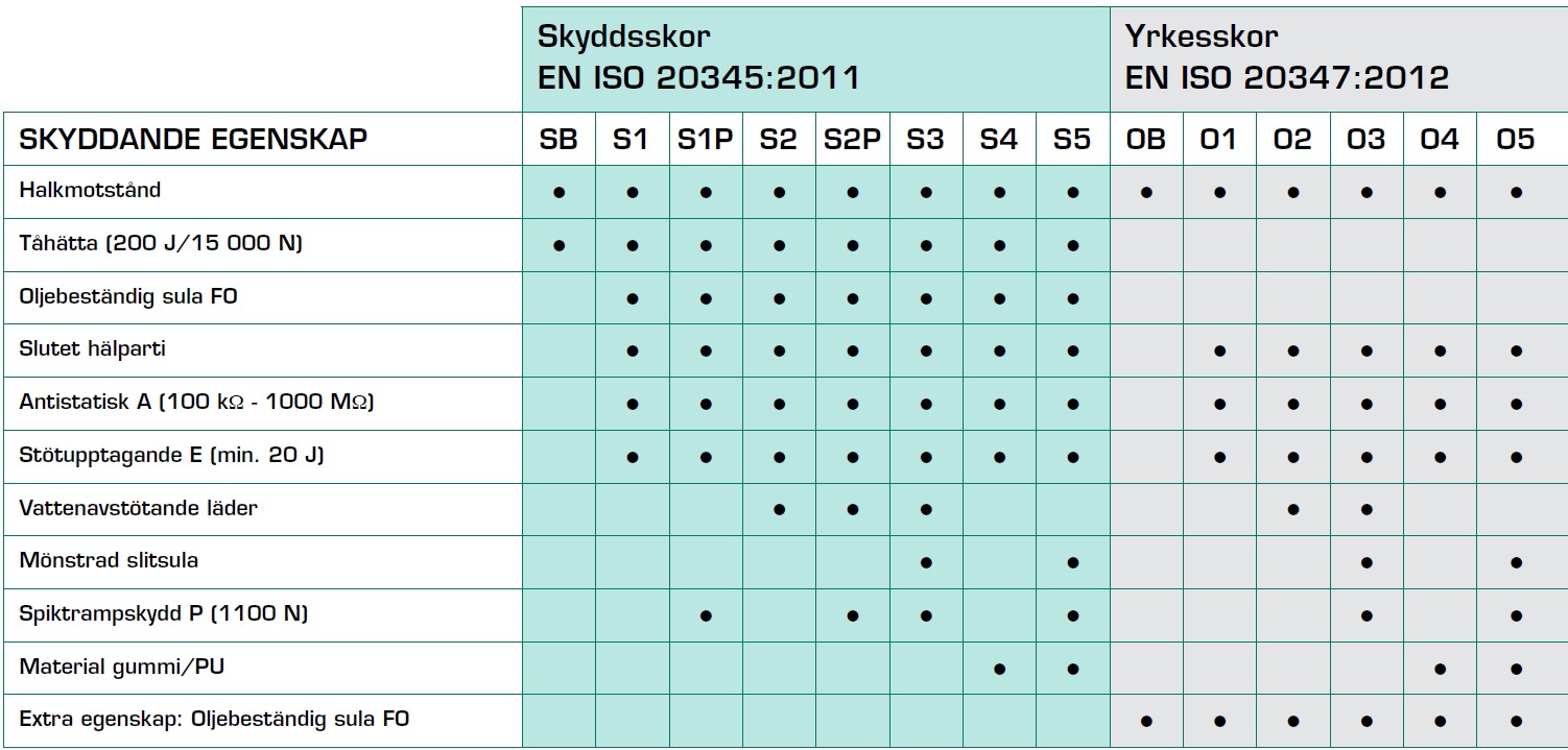 Tilläggsegenskaper enligt standarderna EN ISO 20345:2011 och EN ISO 20347:2012: